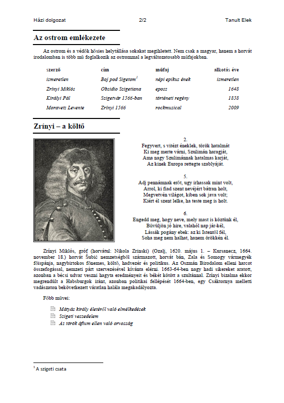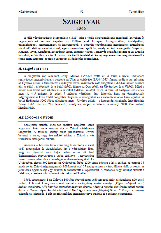 Az Ön egyik ismerősének egy Szigetvárról szóló házi dolgozatot kell készítenie szövegszerkesztővel. A dolgozatot nyomtatva és elektronikusan is be kell adni. Az illető kinyomtatta a végső verziót, de a mentést nem a megfelelő formátumban végezte, így az elektronikus változatot ismét elő kell állítani. Készítse el a házi dolgozatot a forrás segítségével az alábbi utasítások és a minta alapján!