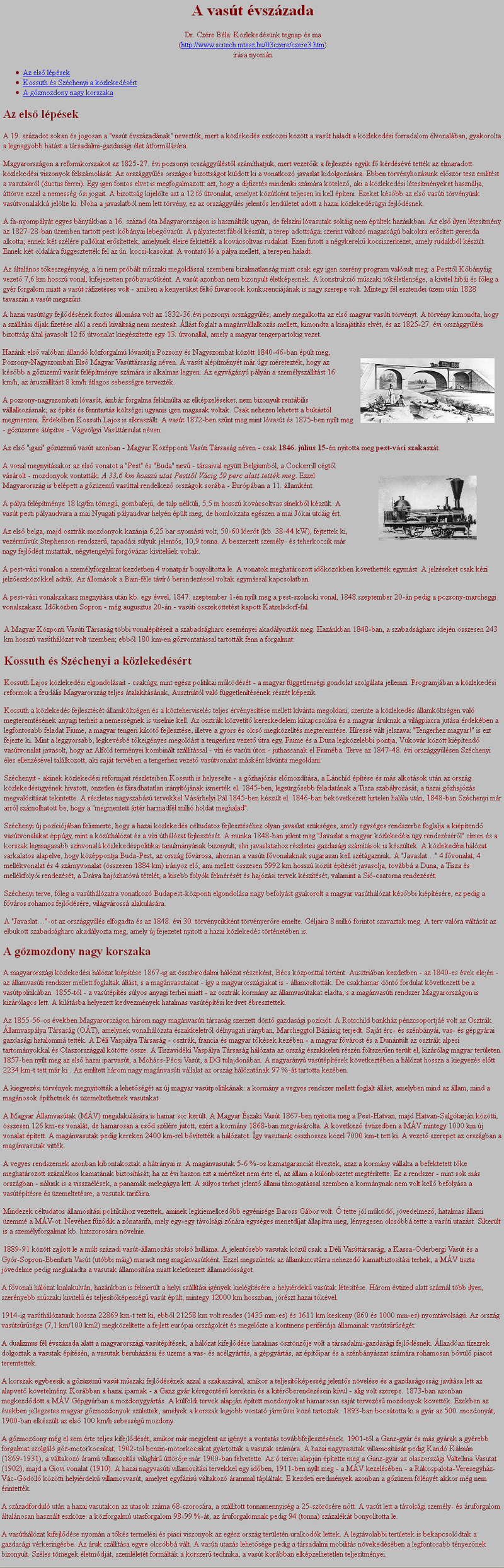 - A szöveg három fejezetet tartalmaz. A fejezetcímek: "Az első lépések", "Kossuth és Széchenyi a közlekedésért", "A gőzmozdony nagy korszaka". Legyenek ezek a címek kettes szintű címsorok!
